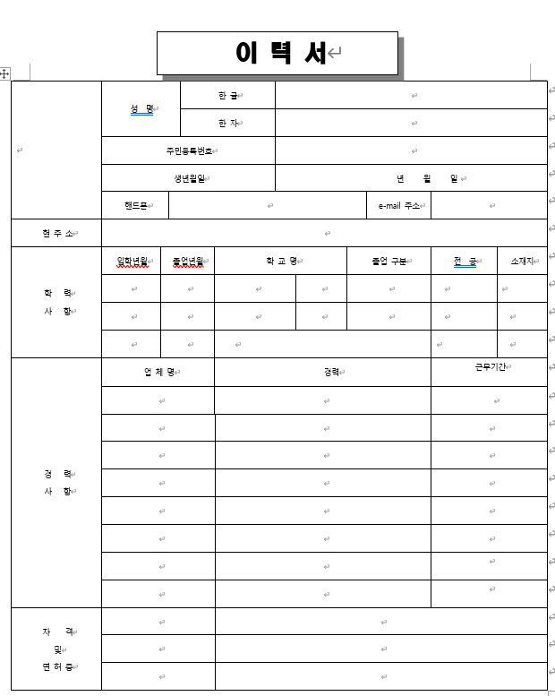 가독성 좋은 경력자용 이력서 양식을 무료로 공유합니다. 워드(WORD) 파일로 구성되어 수정이 간편하며, 실무 경력을 돋보이게 해주는 검증된 서식을 지금 다운로드하세요!